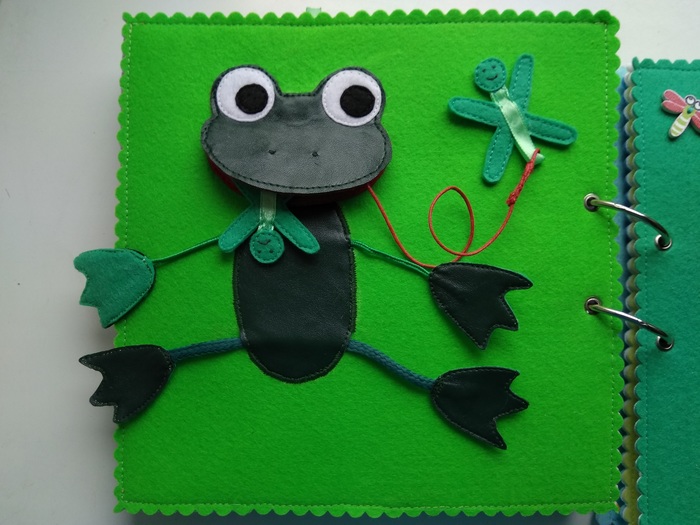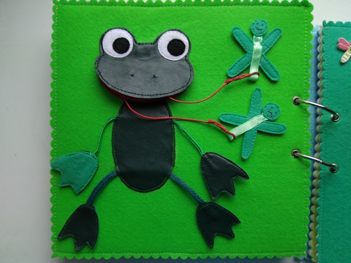 На пятой странице расположилась лягушка из кожзама. Стрекозы крепятся к книжке с помощью магнитов и перетягиваются к лягушке в рот.