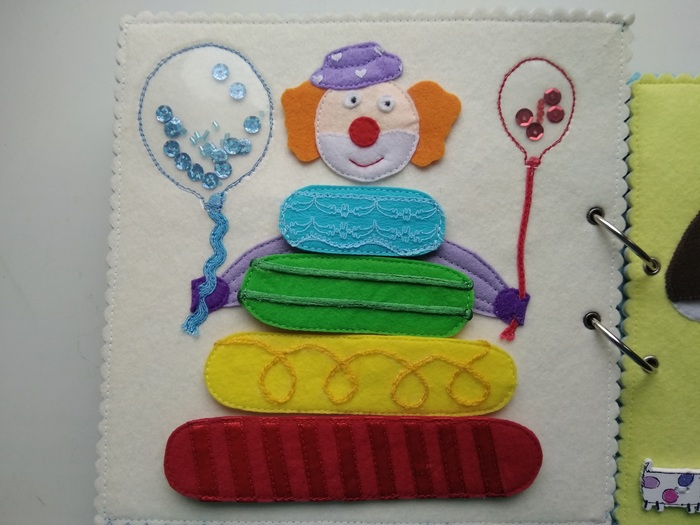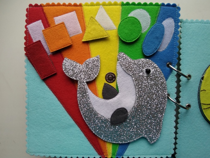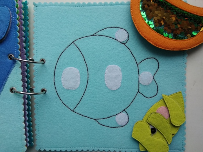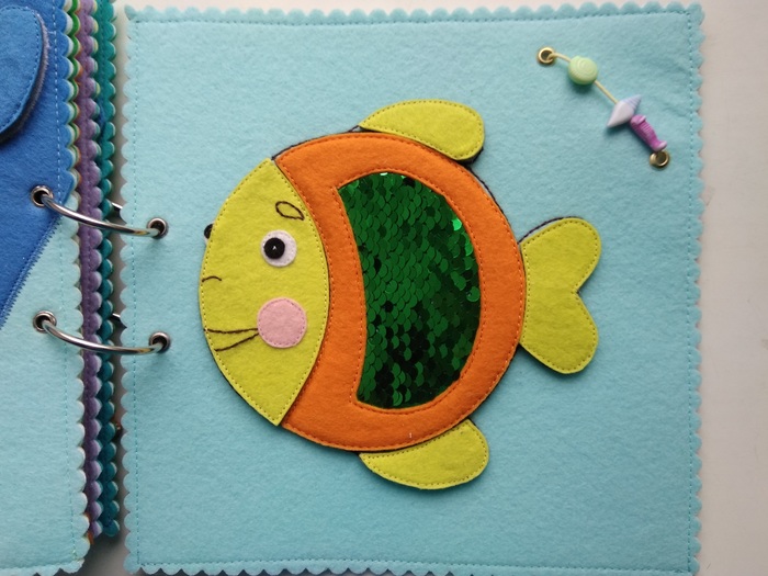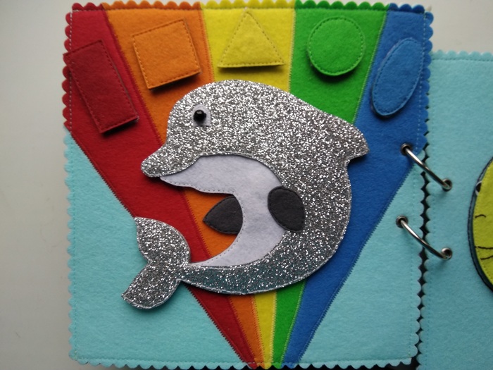 На девятой странице дельфин из глиттерного фетра. Крепится на магнитной кнопке. Геометрические фигуры подбираются по форме и цвету и крепятся на липучке.