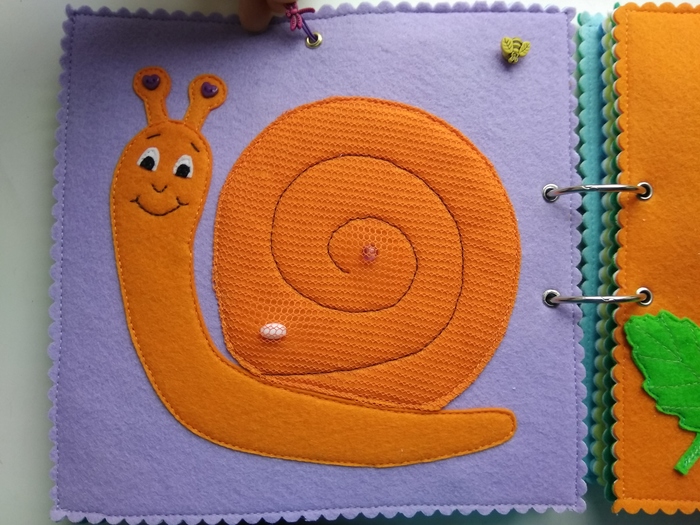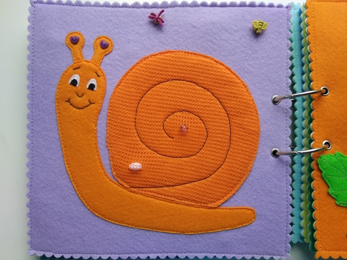 На третей странице улитка-лабиринт. Бусины под сеткой нужно перемещать с одного конца улитки в другой, хорошо развивается мелкая моторика. Стрекоза и пчела на резинках.