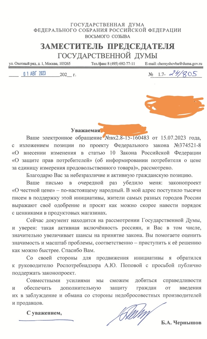 Я напасала и мне сегодня пришёл ответ от Б. А. Чернышева (зам председателя госдумы)