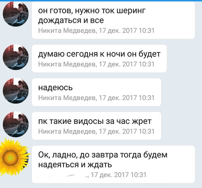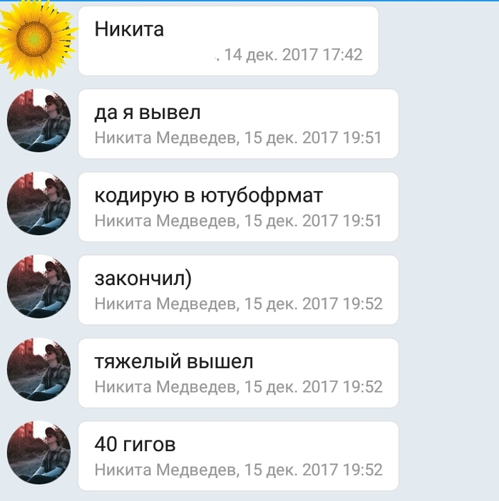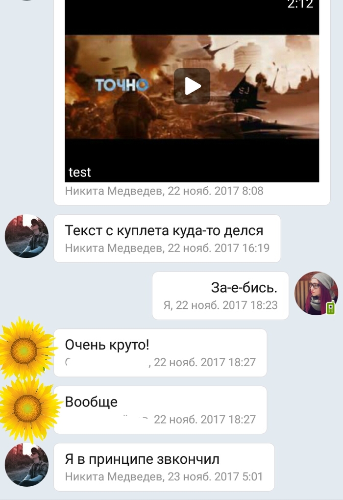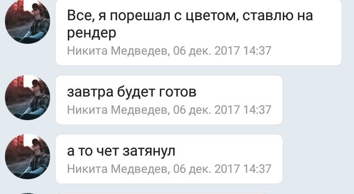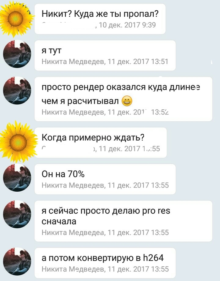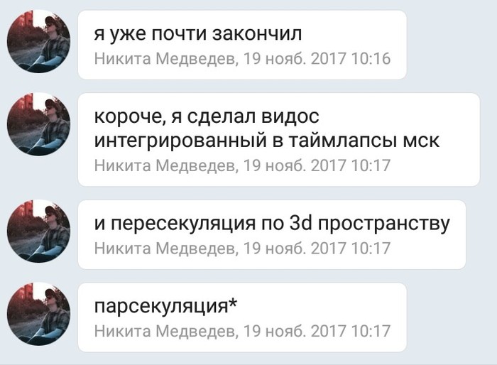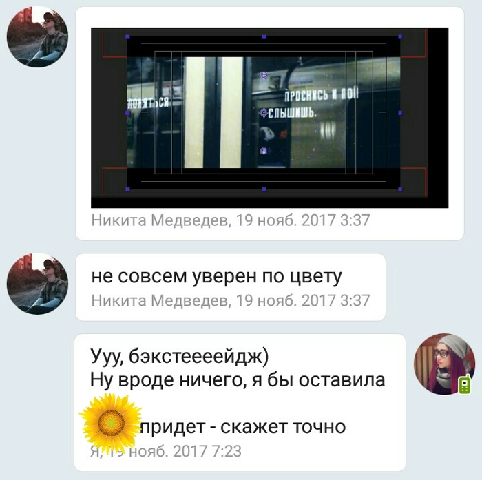 И был нами встречен чувак Никита, который занимается как раз этими видосами + смежными дисциплинами, и работы которого нам приглянулась. Наш лидер связался с ним, объяснил задачу, после чего добавил меня в чат (на случай внезапного творческого видения). Там, пока я дрыхла, они обсудили начала.