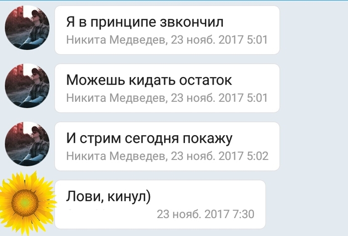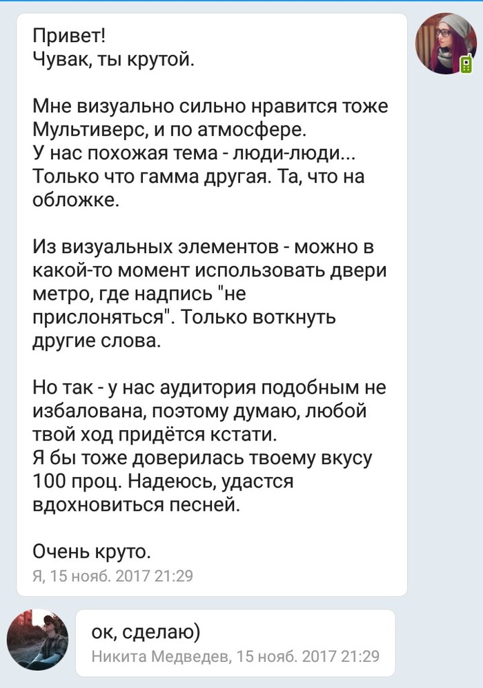 Я проснулась, в диалоге, где они уже обсуждали новые заказы, которые случатся после допиливания лирик-видео (музыкант вдохновился работами Никиты и уже планировалось плодотворное сотрудничество), высказала что-то общее и не сильно важное: