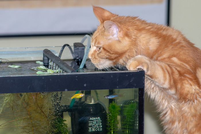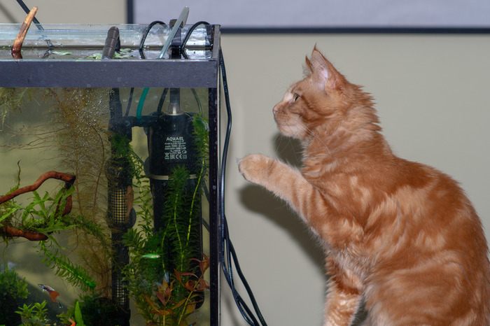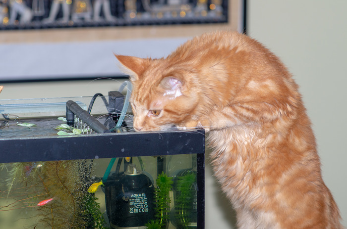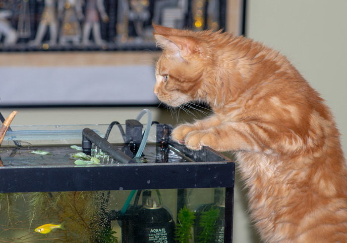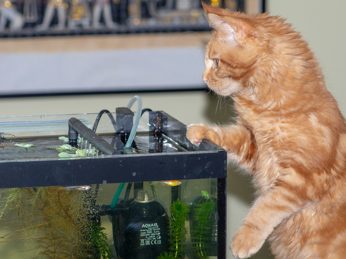 Юная пятимесячная мейн-кунша Моня представляет себе, как вырастет в большую кошку-рысь и будет рыбачить. Но это впереди, а пока для тренировки банка-травник и наивные гупяшки, верящие, что скоро будут кормить...