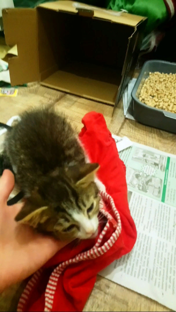 Друг с девушкой под окнами слышат жалобный писк. Спускаются на поиски и со второй попытки находят мелкого котика с выбитой челюстью. (У кого нога поднялась ударить малыша - загадка) На улице такой котенок не жилец. Везут на операцию, лечат. У котика сейчас все налаживается. Пока носит воротник, чтобы в рану не совал лапы. За время лечения подружился с лотком. Мурчалка работает замечательно! Кастрирован "заодно" во время основной операции. Ищет дом! Старший кот категорически отказался принимать "подселенца"( Фото котика прилагаю.