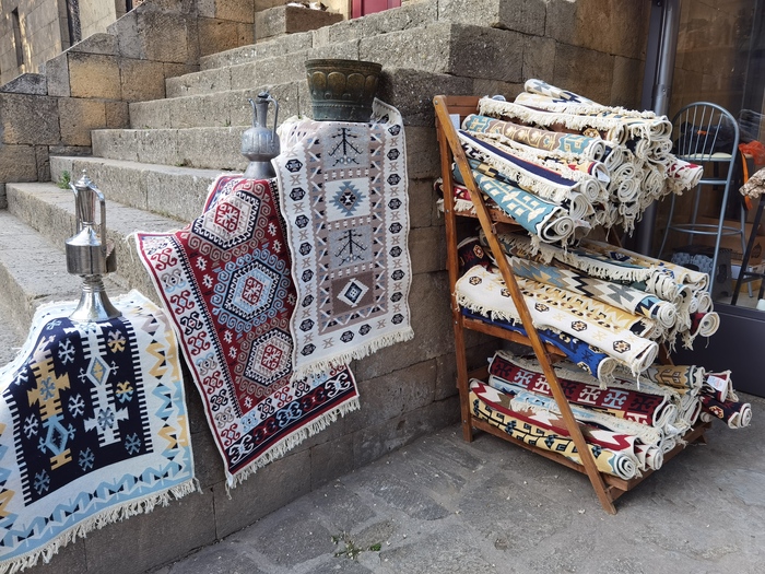 Рынок был неподалёку, поэтому решили прогуляться пешком. Попутно я сорвала несколько ягодок шелковицы. У нее как раз начался сезон и на рынке ее было полно, но домой не довезешь, слишком нежная. Тем более в самолете с фруктами происходит какая-то магия и то что казалось невероятно вкусным у себя на родине, дома оказывается совершенно безвкусным, поэтому мы нацелились на картошку для посадки и большое количество рахат лукума. Картошку купили у аутентичных бабулек, притулившихся под лестницей. По дороге к рядам со сладостями прихватив по дороге свежевыжатый гранатовый сок (невероятно вкусный), пупырчатую пленку для упаковки бутылок и полиэтиленовые пакеты с рисунком дагестанских ковров, раз уж целый я так и не купила. А вот в рядах со сладостями произошел инцидент, про который хочу рассказать подробнее.