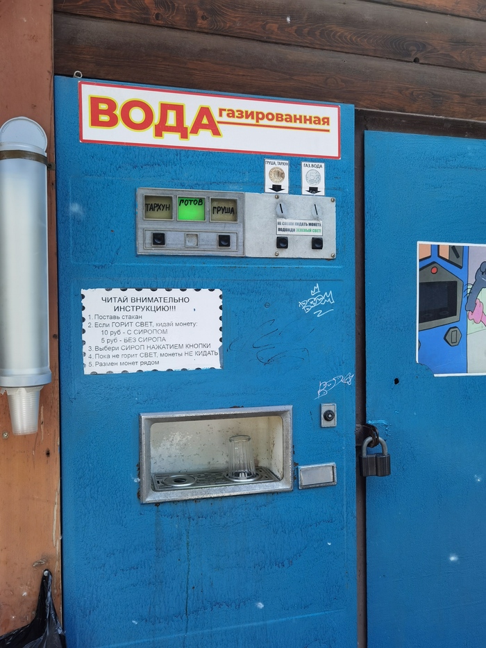 Рахат лукум нам нужен был не абы какой, а непременно мелко нарезанный, с орешками и в кокосовой посыпке. И нормальной консистенции, а не тот что у нас, один крахмал. Сначала я остановилась купить подарочный набор для знакомой. И в спину мне закричала продавщица с соседнего ряда, мол не покупай у нее, иди ко мне. Ну, базара ноль, расплатилась с первой, подошла ко второй, уже набычившейся. Увидела искомый лукум, но странного цвета, спросила можно ли попробовать и с каким он вкусом, на что получила длиннющую отповедь, что у первой продавщицы я ничего не спрашивала, а в сумку сунула и все, а ее, значит обижаю таким количеством вопросов, и вообще... Причем все это было с таким негодованием, что я чуть ли не ворую тут... И вот лично ее обидела. Мне, конечно расхотелось у нее что либо покупать и я ушла, тем более, что через пару рядов мы нашли, что искали и даже больше и дешевле в два раза, затаившись на несколько тысяч. Вот что в голове у скандалистки? У тебя товар дороже, да ты облизать должна с ног до говы, лишь бы мы не ушли, или она думает, что мне станет стыдно и я в порыве раскаянья куплю у нее весь ассортимент? Так вот. В Пятигорске, Карачаево-Черкесске и прочем Кавказе все рыночные продавцы именно такие, что поначалу ввело меня в ступор. Покупаешь у одной, обижается весь рынок. Ты, вроде и не против купить что-нибудь и у других, тем более ассортимент разный, но даже не хочется, глядя на их обиженные лица, разговаривающие с тобой сквозь зубы. То, что там не торгуются я поняла сразу и даже не пыталась, а вот такое поведение до сих пор для меня загадка. В Дагестане же мне попалась одна единственная тетка с таким поведением и для меня это несомненный плюс. И вообще даги гораздо более открытые и доброжелательные, чем уроженцы Приэльбрусья. Впрочем, мы закупились и пошли к машине, по пути встретив аутентичный советский автомат с газводой. Прям с граненым стаканом фонтанчиком для мытья, все как полагается