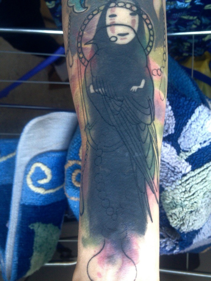 И эта же работа в 2023 году , коррекция только птички на предплечье и символ у персонажа на плече.