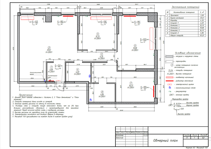 - Обмерный план - тут можно много сказать зачем он нужен, хватит на отдельный пост. Главное знать, что он должен быть грамотным со всеми размерами, коммуникациями, высотами и обозначением материалов стен и перегородок