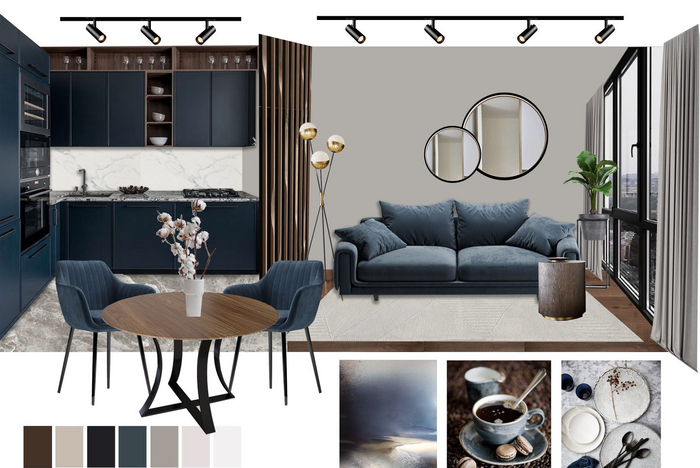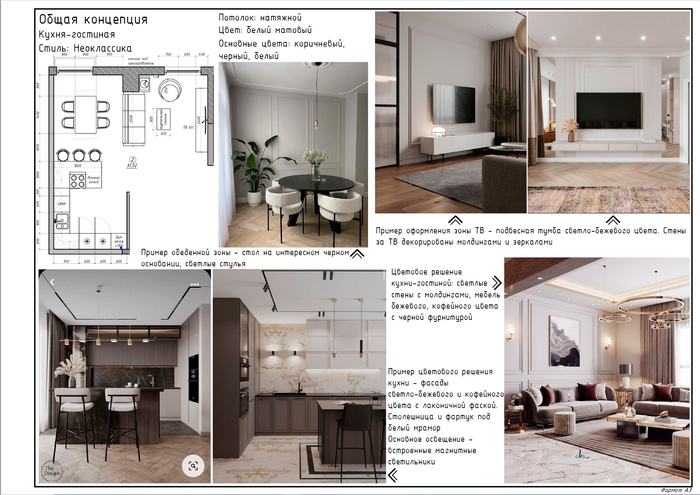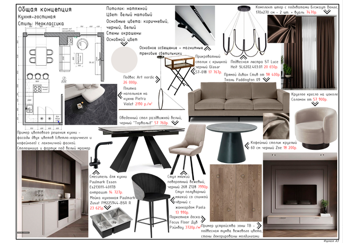 Этот этап некоторые дизайнеры пропускают, а зря! Лучше составить коллажи по каждому помещению, где будут как примеры, которые +/- показывают тот дизайн, на который будем ориентироваться, а также реальная мебель, свет и материалы с указанием цены - это и значительно ускоряет составление визуализаций, и помогает следить не выходим ли мы за рамки бюджета. Уже на этом этапе можно понемногу заполнять спецификацию.