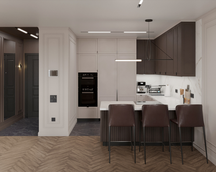 Визы часто редактируются по несколько раз. И это при том, что уже были согласованы коллажи - без них же этот процесс может растягиваться на очень неприятный срок. Как видите на примере уже другие барные стулья - заказчики не сразу определились с выбором. И это нормально! А вот понять, что нужно вообще всё переделать от планировки до стиля на этапе визуализаций, уже не нормально.