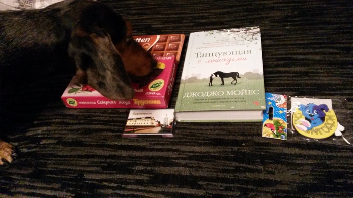 А вот что : Магнитик 2шт) Очень вкусный шоколад, мармелад из брусники (я такого не видела у нас ) Открытка с пожеланиями и еще карточки -открытки из разных мест. А самое главное книга, моя дочь не любит читать (к содержанию ) но сказала что эту книгу обязательно прочтет, чему я ОЧЕНЬ рада ))