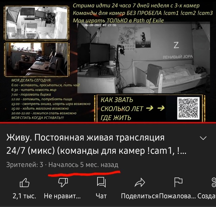 Путешествуя по просторам ютуба наткнулся на необычную трансляцию. Загадочный человек уже 5 месяцев бесперебойно целиком и полностью транслирует свою личную жизнь в прямой эфир. Зачем ему это? Неужели кому-то доставляет удовольствие каждый день, каждую минуту находится под недреманным оком вечно работающих камер, когда за твоим существованием может наблюдать кто угодно из любой точки земного шара?