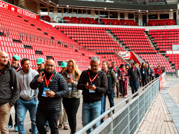С одной стороны, мне хочется идти и болтать со своей командой, с другой мне комфортно идти в более быстром темпе. К тому же, в первой четверти маршрут проходит мимо нашего дома и муж и сын ждут меня, чтобы помахать с балкона. Я ухожу в отрыв от своей команды. В начале идти оч сложно, потому что огромная толпа людей. Я думала, что мы будем просто идти по городу, но оказывается, по дороге будем проходить через всякие интересные места. Вот я прохожу через стадион Филипс.