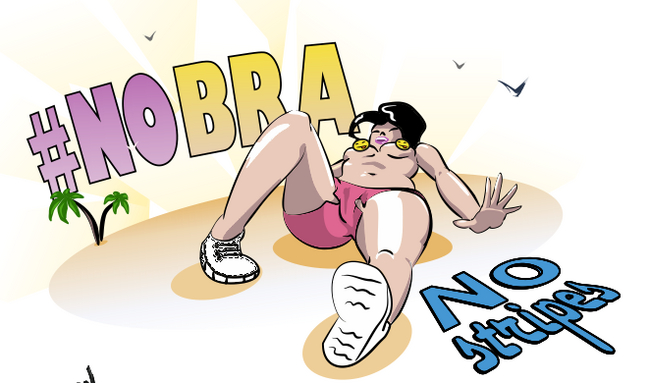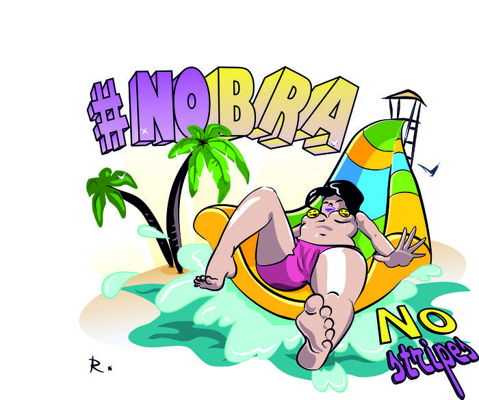 Чтобы не уйти в "запрещенку", решил девушку приодеть и, под возможную печать на светлой футболке, нарисовать ей солнечный фон. При "одевании" и всплыла в памяти шутка: "Нет лифчика - нет полосок" , ну и собственно шутливая движуха из этих ваших интернетов - "#noBra". По примерам из инета поправил и "кисть" руки: