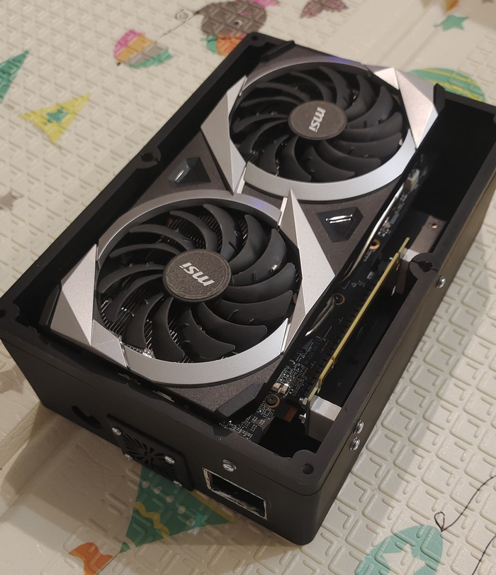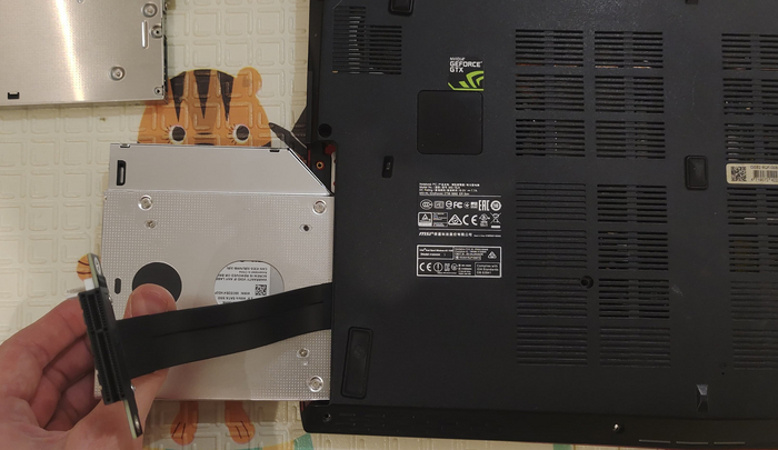Вариант 1: "Подключение внешней видеокарты к шине PCI ноутбука возможно при помощи переходника для разъема mini PCI Express ( обычно используется в ноутбуке для wi-fi адаптера). Такой разъем поддерживает только один канал шины PCI-e. Вместо Wi-fi адаптера устанавливается переходник, который подключается USB-кабелем к плате-райзеру. Видеокарта устанавливается в райзер. На райзер подается питание от внешнего БП...