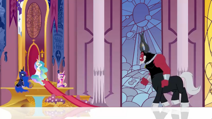 Услышав эту увлекательную историю, Искорка уже было начала представлять, как будет останавливать злобного ирода, но Селестия ошарашивает её тем, что для битвы они выставят Дискорда.