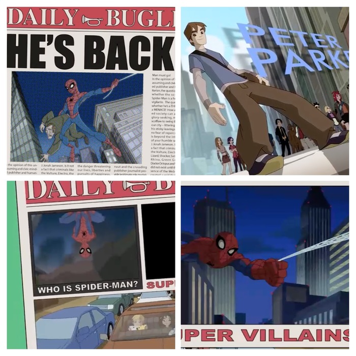 Также заставка визуально рассказывает нам инфу про паука: что он Питер Паркер, вот его друганы: Гарри Озборн и Гвен Стейси, и ему приходится сражаться со всевозможными злодеями.
