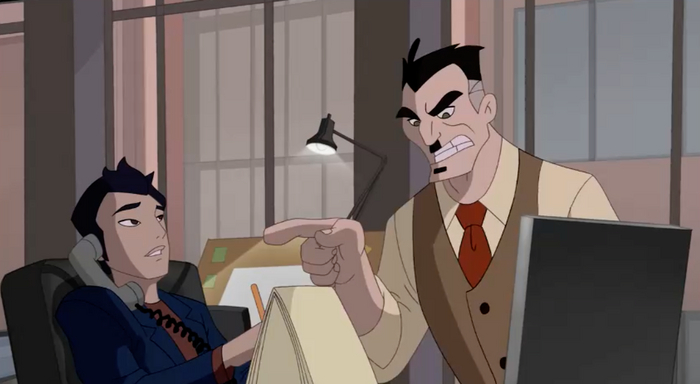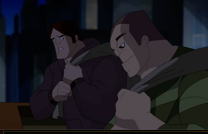 Босс приказывает своей правой руке позвать ребят посильнее, чтобы разобраться с мешающим супергероем.