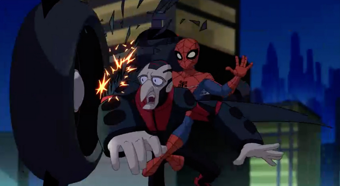 Стервятник после получения отказа от Озборна рассказать правду о краже изобретения бросает того с высота. Спайди успевает спасти батю своего друга.