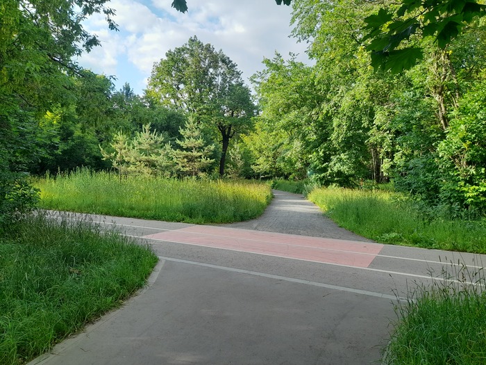 Дальше ещё одно изменение маршрута. Благодаря тому, что на пересечении Главной аллеи с Московским проспектом зебру почему-то не предусмотрели, поворачиваем и идём чуть севернее.