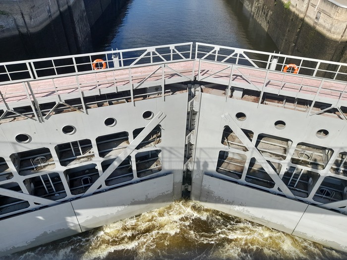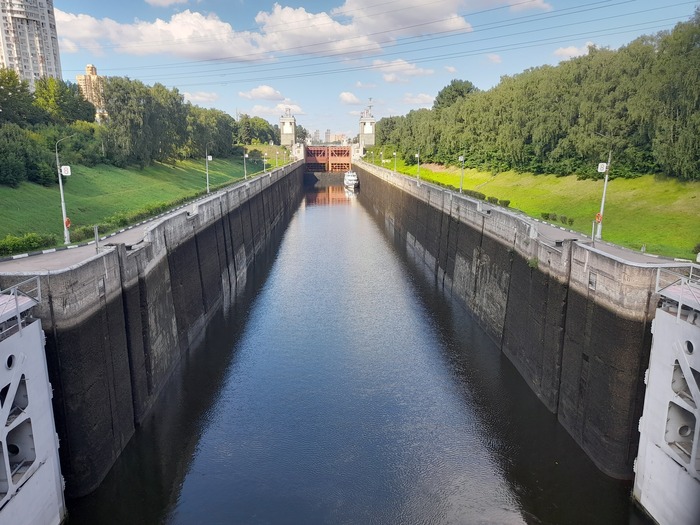 Нечасто бываю в Тушино и окрестностях, и одно из моих любимым мест там - это шлюз №7, через который проходит пешеходный мостик из парка Покровское-Стрешнево в сторону улицы Свободы. Этот мостик используется также в качестве смотровой площадки, с которой можно понаблюдать за процессом шлюзования. Раньше, конечно, больше был размер грузового движения по Каналу имени Москвы, поэтому сейчас, после закрытия Западного порта и причальной стенки Краснопресненского завода ЖБК, сам процесс шлюзования можно наблюдать уже реже. Но по-прежнему ходят теплоходы от Северного речного вокзала в сторону реки Оки, да и баржи и сухогрузы тоже можно увидеть.