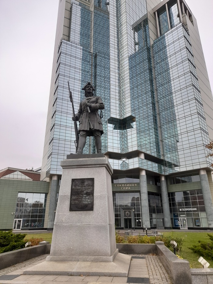 У метро "Семёновская" построили бизнес-центр "Соколиная гора", перед которым стоит памятник Гвардейцу Семёновского полка.