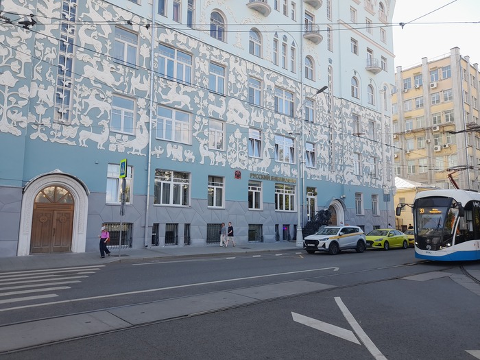 Это здание на Тверской легко найти благодаря стоящему рядом памятнику Станиславскому и Немировичу-Данченко.