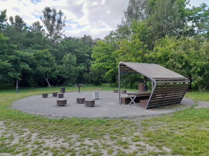 Как раз параллельно МЦД-4, между платформами Чухлинка и Кусково, расположено множество площадок для шашлыков. Часть с такими укрытиями, часть без. Часть вот так открыто, часть в тени деревьев.