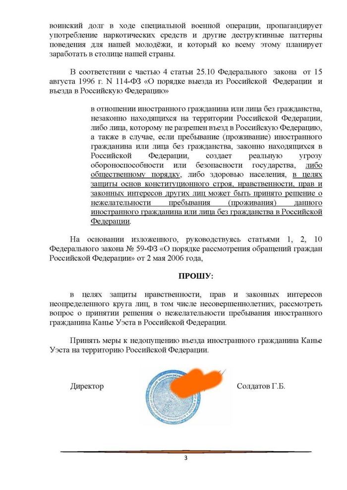 Активистам не понравилась строчка в композиции Vultures, где упоминается русская девушка, которую исполнитель хочет «наказать» за ситуацию на Украине. В случае, если тест написал Уэст, ему следует запретить въезд в Россию, считают общественники.