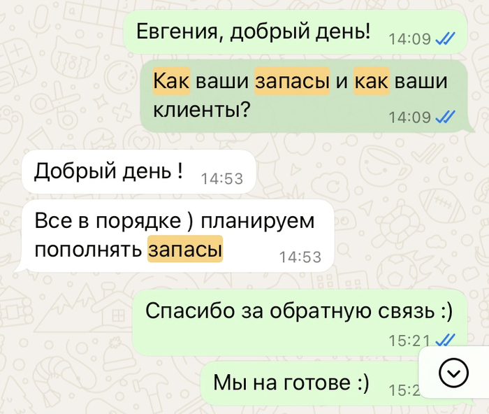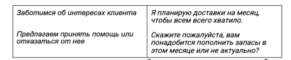 Оказалось, что такая модель вопроса помогает не только «двигать» сделки с этапа на этап, но и ослабляет страх отказа, который часто крадет удовольствие от работы продавца. Я ведь выхожу к клиенту не с целью получить заказ, а с целью позаботиться о его запасах.
