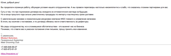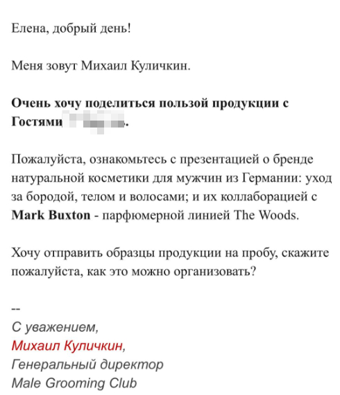 Сейчас бы я, конечно, написал по-другому, но и это «такое себе» письмо сработало. Я был в шоке, когда через несколько недель закупщик ответил на это письмо и запросил образцы продукции.