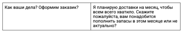 Вторая модель вопроса в моей компании работает в восьми случаях из десяти — восемь из десяти клиентов положительно реагируют на сообщение: трое оформляют заказы, пятеро отказываются, но благодарят. И только двое игнорируют сообщение или выражают недовольство тем, что их беспокоят. Как правило, мы исключаем этих клиентов из списка контактов и в следующем месяце их уже не беспокоим.