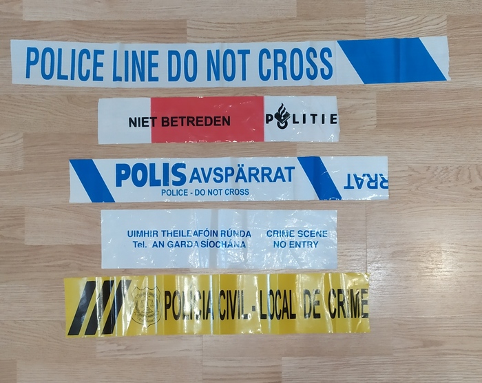 Также, совершенно случайно, я начал собирать так называемые "crime scene tape" - ленты, с помощью которых оцепляют место преступления. Не то чтобы я целенаправленно их искал, просто несколько раз полицейские мне прислали их в подарок