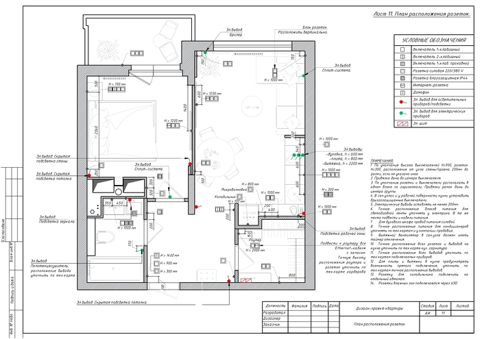 План розеток. Вообще их здесь маловато. клиентка дома только спит, максимум ноутбук включает. У меня такая же квартира счас в ремонте (как закончу - покажу) - в ней около пятидесяти точек под розетки/выключатели.