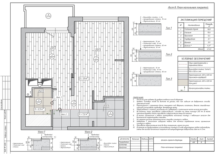 План полов. Керамогранит в прихожей с нетипичного места раскладывается, чтобы влезло ровно два ряда плитки. А место раскладки потом закрывается коробом скрытой двери.