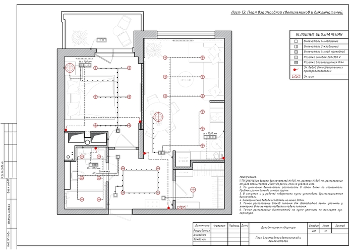 самая интересная часть для обывателей. Группы света. В спальне проходные выключатели, чтобы в кровати общий свет выключать. Остальные выключатели простые.