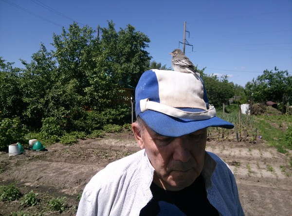 Такой вот птиц решил приземлиться на голову моему деду и позволил себя погладить даже, понятия не имею, почему он выбрал такое место для приземления)