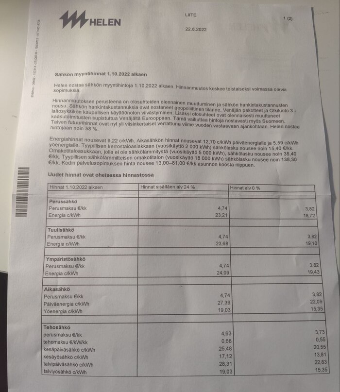До прошлой весны в Финляндии электричество было очень дешевым, особенно на фоне высоких доходов. Многие домохозяйства не парились, тратили энергию не раздумывая, даже в новые частные дома устанавливали электрическое отопление. Ночью электричество отдавали почти даром, даже зимой. С Февраля все резко изменилось. С прошлого года у меня электроэнергия подорожала более чем в 5 раз.