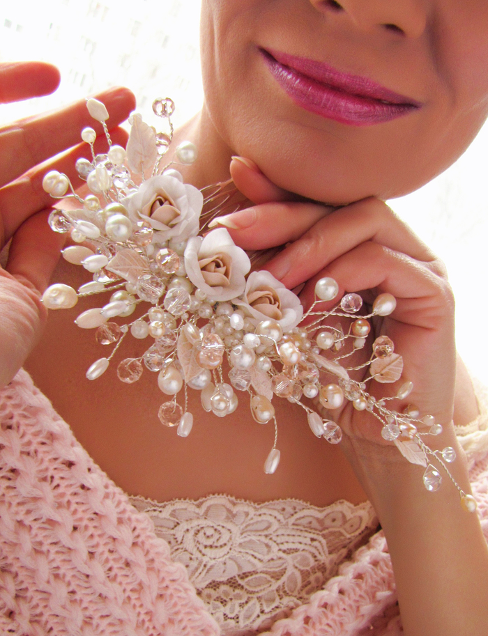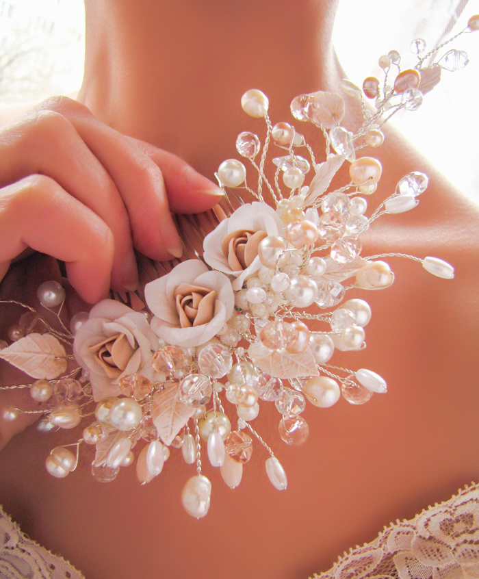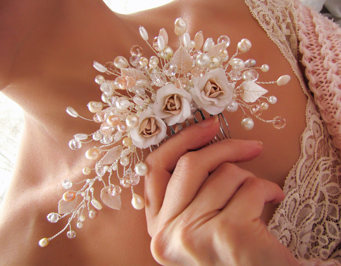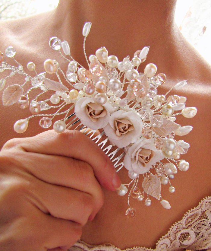 Похвастаюсь своим творчеством. Это свадебный гребень для прически невесты, один из многих, мною сделанных. Тут все - ручная работа: цветы и листочки лепятся вручную, веточки-скрутки , все делается своими руками.