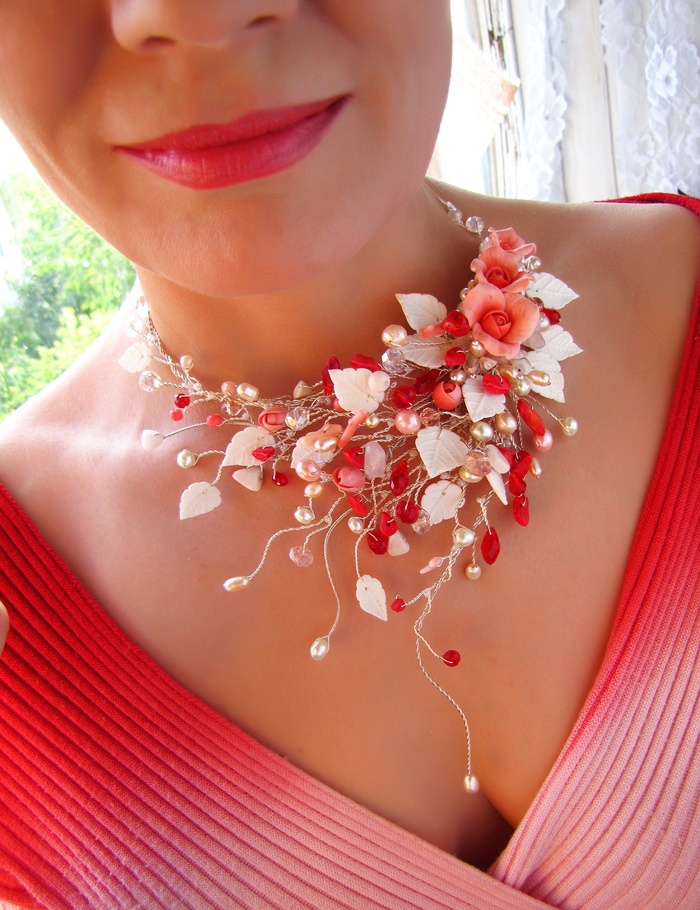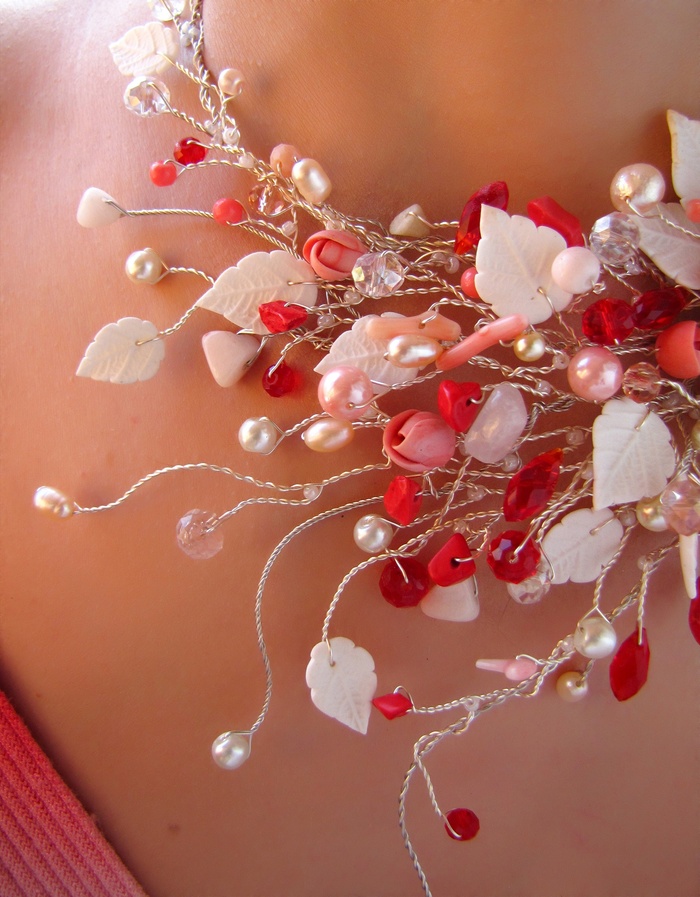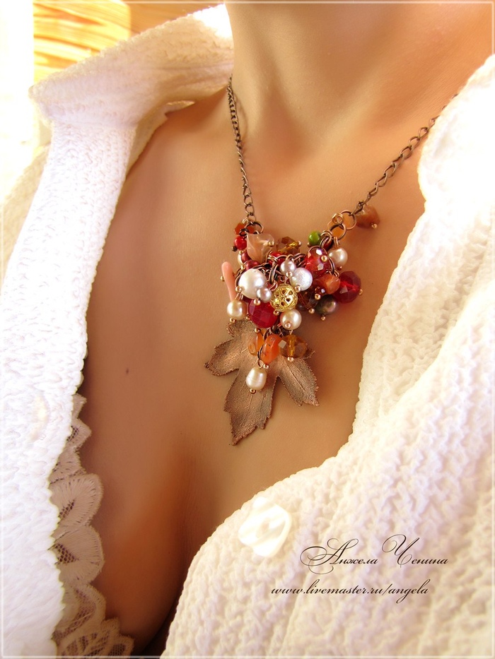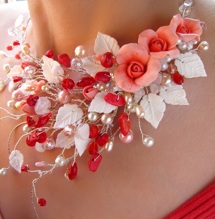 Техника исполнения тут авторская, моя личная, хотя принцип - хорошо известный многим мастерицам wire wrap. Жемчуга много в этом колье, кораллов, кварца, бисера тоже достаточно. :-) Цветы и листья вылеплены вручную.