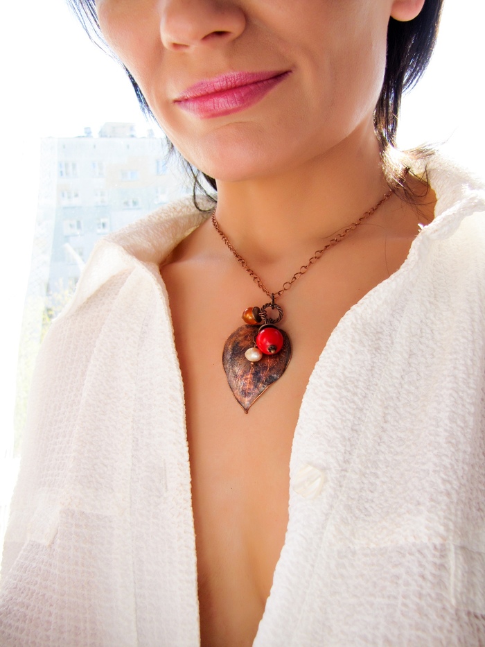 @NphERNO на самом деле умеет делать гальванопластику гораздо лучше, чем показал :-) Вот тут все медные листочки (это мои украшения разных лет, давние в основном, сейчас я гальваникой почти не занимаюсь) - его работа. Листья роз на браслетах, желудь, "крылатка" ясеня, листочки пишты и сирени. Все они на самом деле блестят при полировке, а особо красиво смотрится кайма из ... шариков таких крохотных, вроде как окалина, я сама так делать не научилась.