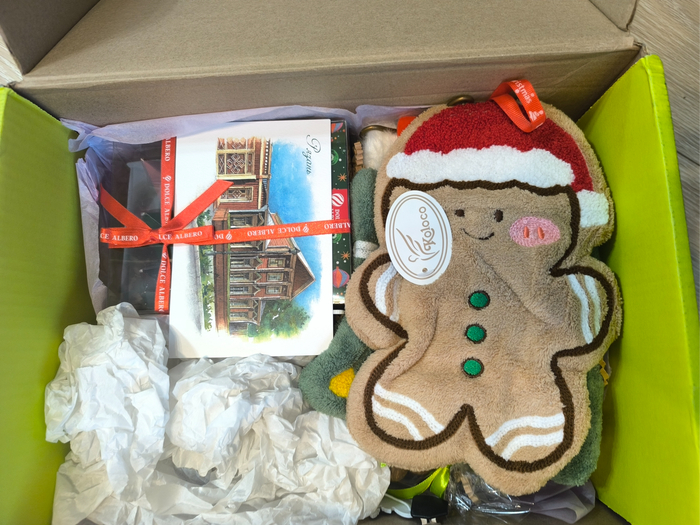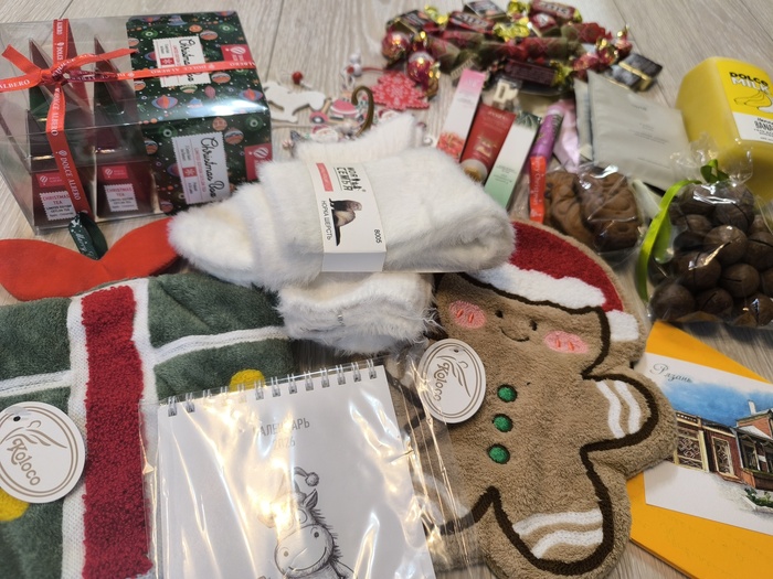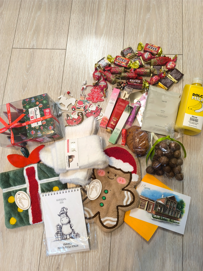 Полное фото подарка прилагаю: чай, кофе,сладости, косметика, носочки с шерстью, орешки, милые ёлочные украшения, новогодние прихваточки для кухни, классный позитивный календарик.
