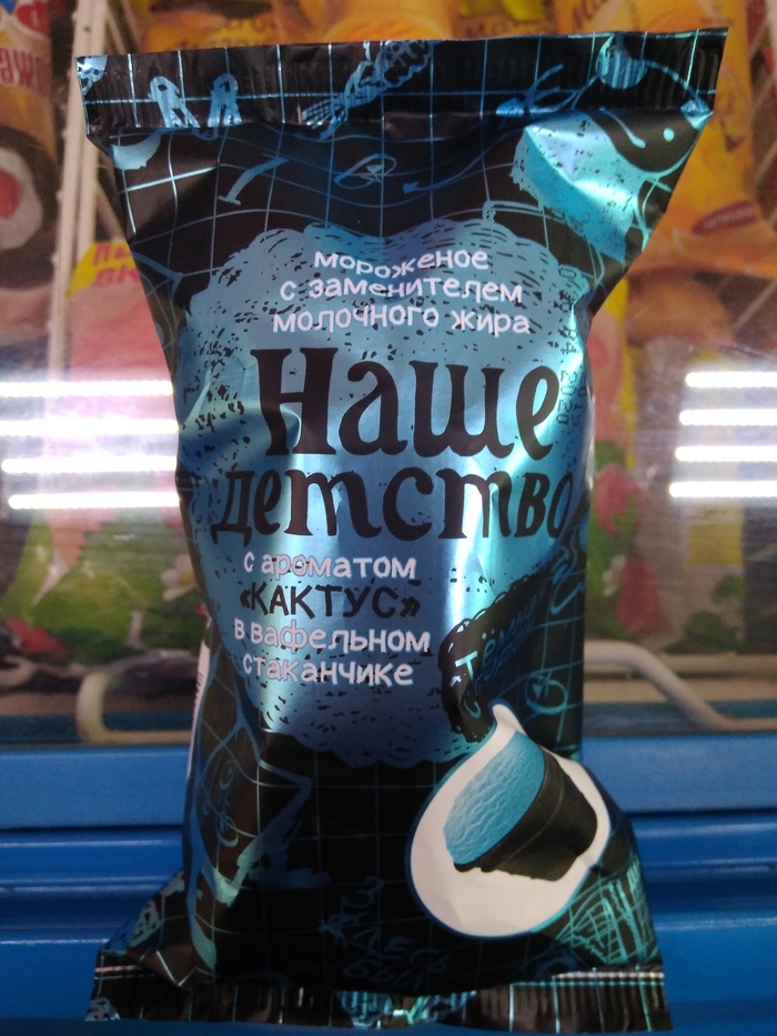 Нашла в своих архивах фото вот такого необычного мороженого с ароматом "кактуса". Маркетинг сработал, внимание привлек. Кактусы я не пробовала, поэтому сравнить не с чем))) Само мороженое бирюзового цвета, вкус приятный, но сложно описуем. А производят такое мороженое в Белоруссии :)