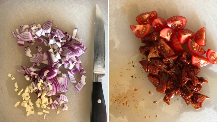 Нарезаем лук, чеснок, помидоры свежие и валяные, обжариваем их в кастрюле на оливковом масле и сильном огне минут 5-7.