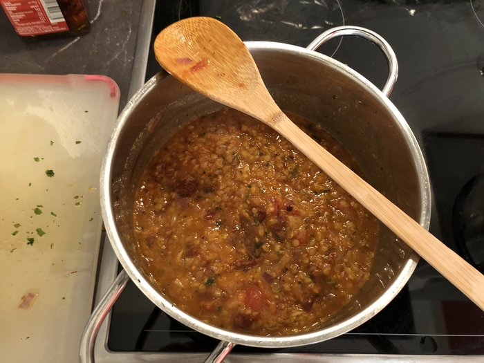 Добавляем к овощам уже сварившуюся чечевицу. Если слишком густо, добавляем овощной бульон. Варим ещё минут 5-10. Добавляем специи.