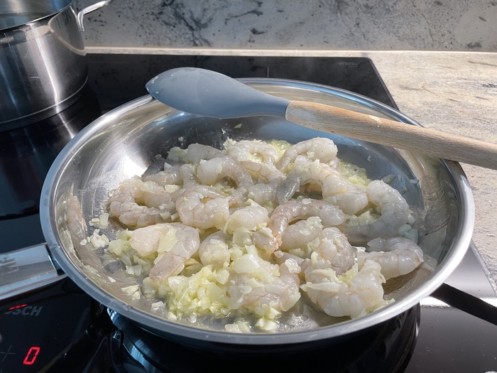 Сегодня моя очередь готовить ужин и я заглянул в морозилку. Там одиноко, в вечной мерзлоте, лежали креветки. «И зачем они тут нужны?» — подумал я и решил сделать из них вот такой простой ужин для двоих.