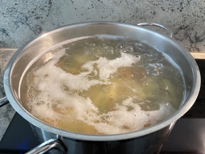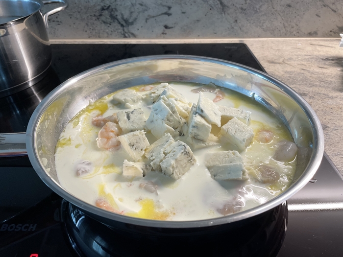 Дальше вливаем сливки и забрасываем горгонзолу, лучше порезанную на кусочки, добавляем специи, убавляем «огонь». Крышкой не закрывать! Сыр должен раствориться и соус загустеть.