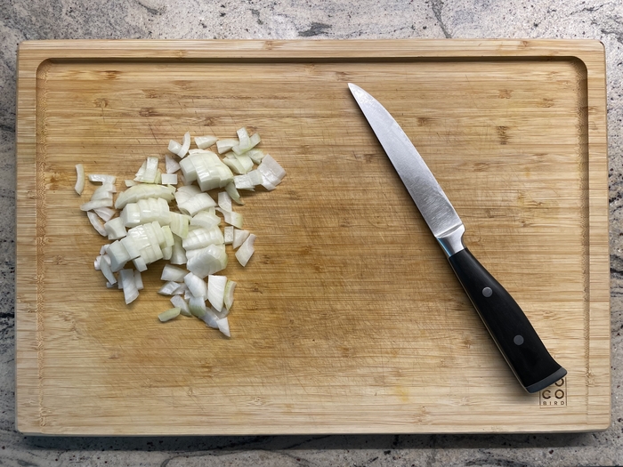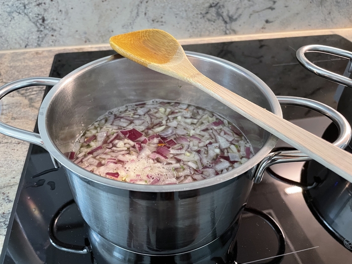 Бульон довести в кастрюле до кипения и забросить туда лук. После 3-4 минут интенсивного кипения выключить и отставить в сторону.