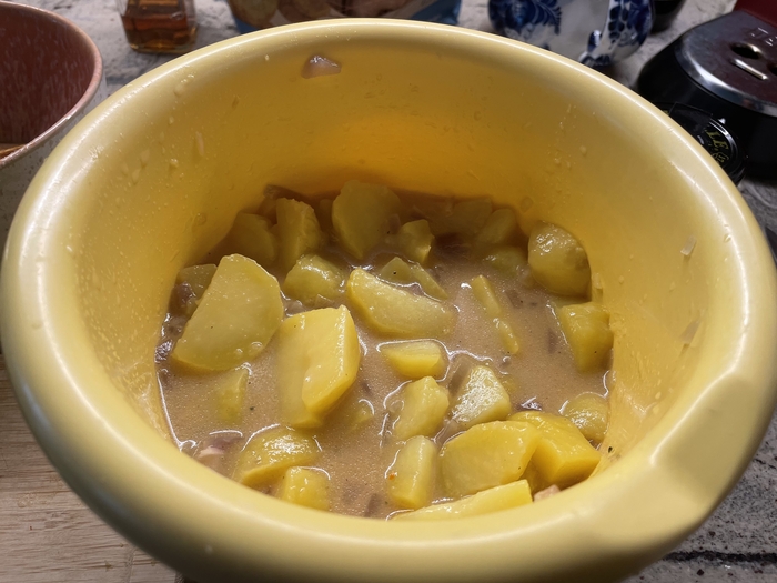 Залить картошку смесью горчицы и уксуса, потом добавить лук с бульоном. Добавлять постепенно, не все сразу, чтобы жидкость не покрывала всю картошку. У меня осталось немного бульона. Дать пару часов настояться.