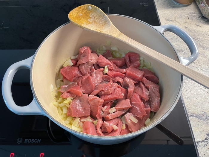 Когда половина пива выкипит, добавить бульон. Убавить «огонь» и тушить минут 30. Далее добавить муку. Можно не всю, но что бы достигнуть нужной густоты. Хорошо размешать!